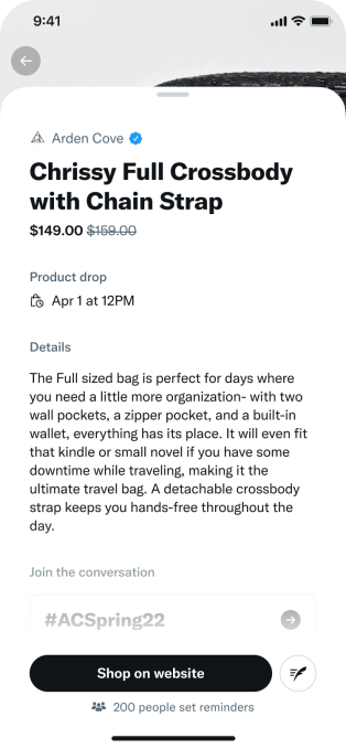 “When a brand you love is launching something, you want to be first in line to grab that hot new thing before it’s gone. Product Drops is designed with this in mind,” explained Twitter Product Manager Justin Hoang. “Shoppers can get details about the product on the Product Details Page, set a reminder so they don’t miss the drop and they can see what other shoppers are saying — all without leaving Twitter. We’re excited to give shoppers a way to do more than just talk; with Product Drops, we’re making it easier to go from conversation to product discovery to purchase,” he added.