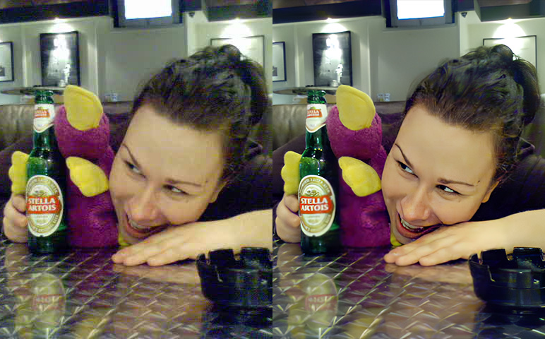 I tried out Picsart’s tech on a slew of old photos and was consistently impressed and surprised by the results. Here’s another, also taken with the Sony Ericsson K608i camera — the sharpening and contrast looks a tiny bit on the creepy side, but the sharpness in Ashley’s face and the crispness of the bottle’s label is very impressive indeed.