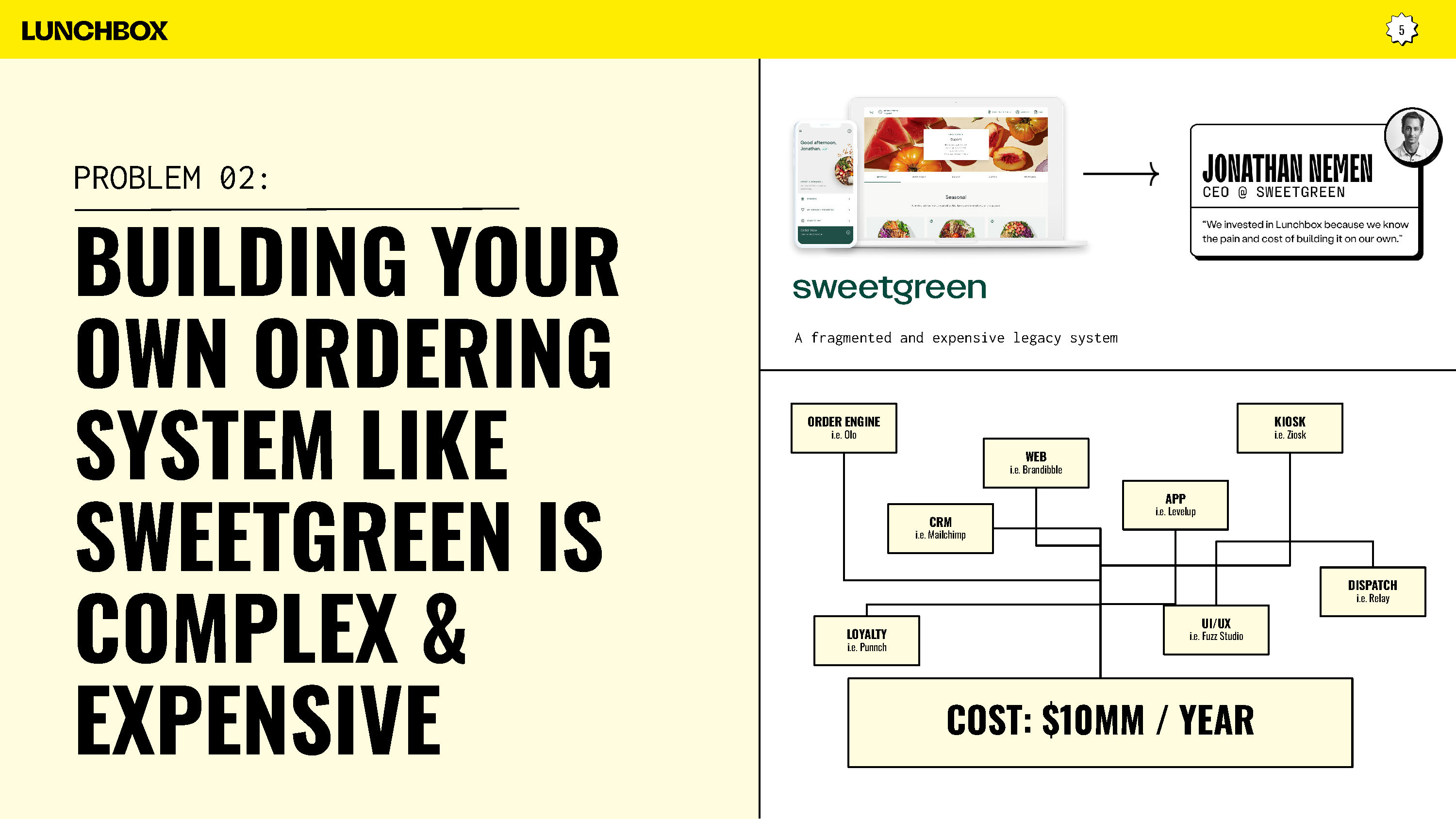 On this slide, I can 100% imagine how the CEO weaves a narrative. They could start by explaining why Sweetgreen is struggling with its complex home-built ordering system, and how the Lunchbox team spoke with the Sweetgreen CEO to convince them to join Lunchbox instead. They probably used a message along the lines of: “Are you a software development shop or a restaurant chain? And if you’re the latter, wouldn’t you rather focus on opening more restaurants rather than cobbling together a user experience from a half-dozen different components and vendors?”
