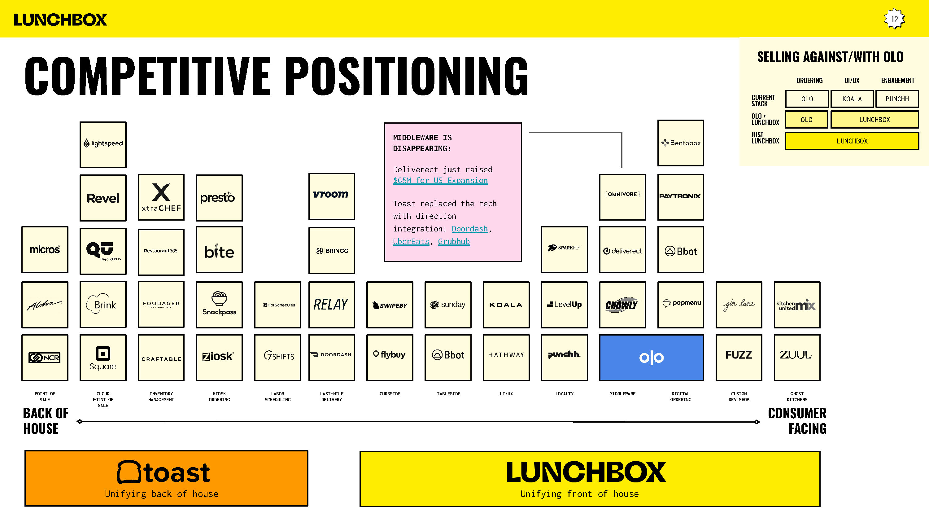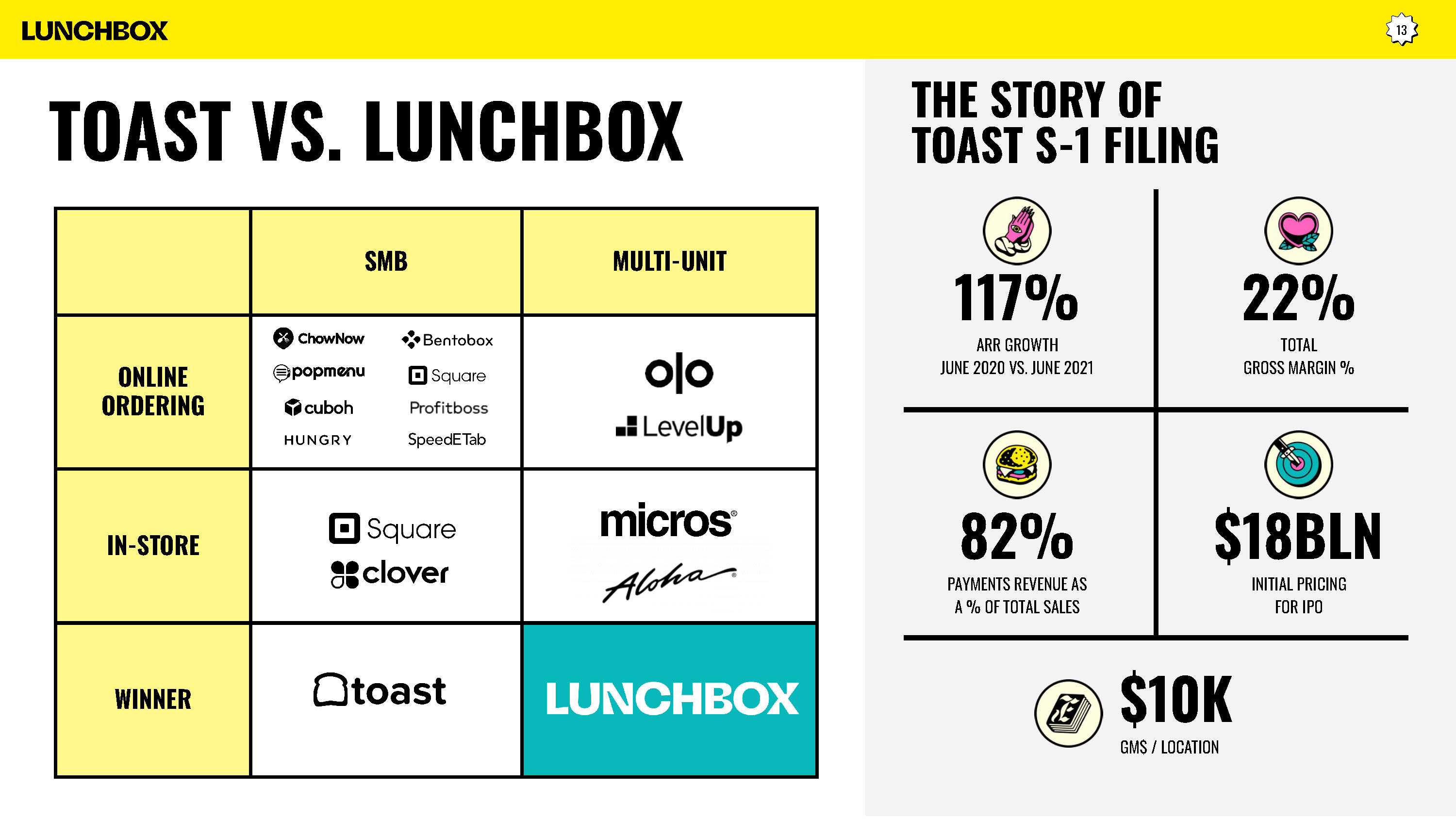 Looking at Lunchbox’s competitive positioning slide (slide 12), I feel a bit of PTSD kicking in, and I suspect Lunchbox will have had similar pushback. There are 43 competitors on this slide, which is a god-awful mess. Lunchbox is doing an elegant sidestep here, which is basically saying that Toast is gobbling up the left-hand side of this chart, and Lunchbox is chomping down on the companies on the right.