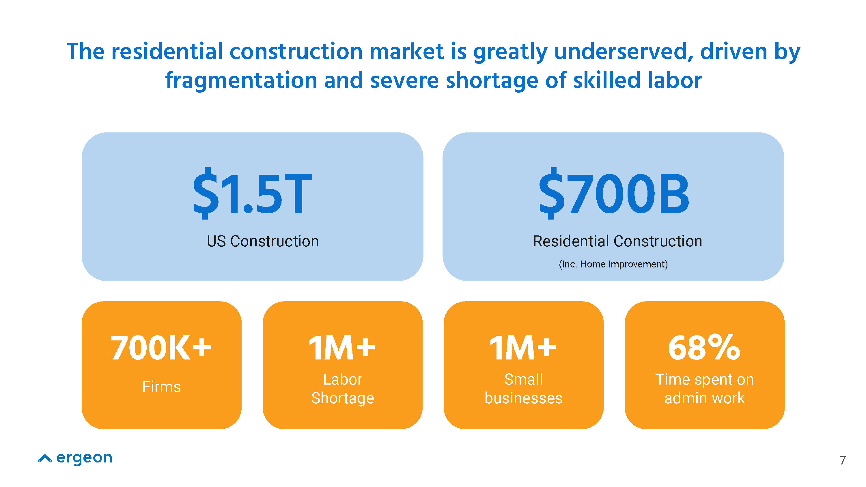 Well, the seventh slide rams that point home with gusto and elegance. It’d be a very unambitious investor indeed that’s willing to ignore a TAM/SAM of $1.5 trillion and $700 billion, respectively. The next row of numbers pulls on a variety of other important strands of this conversation: It’s a very crowded market without a clear leader (700,000+ firms), there’s a desperate shortage of skilled labor (1 million+ labor shortage), there are a ton of small independent contractors out there that are overwhelmed and cannot operate efficiently, and the industry as a whole spends more than two-thirds of its time on admin.