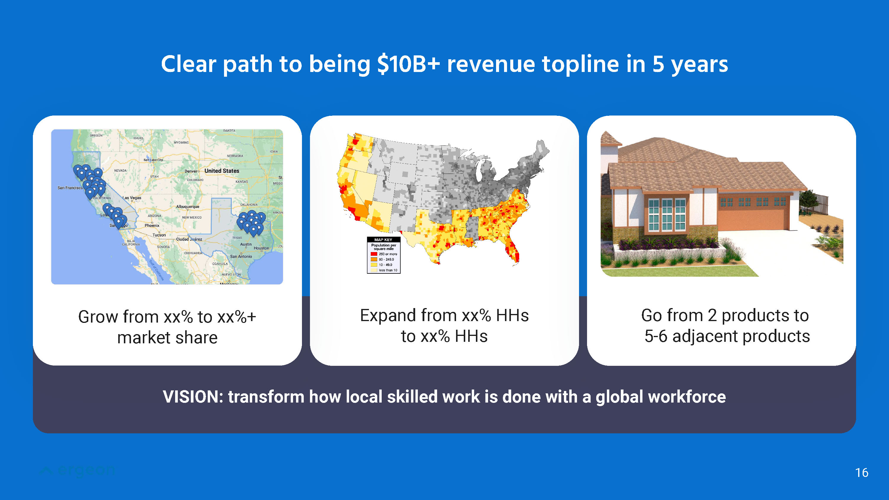 When I got to the last slide of the deck, I realized that the company hadn’t mentioned how much it was raising or what it was planning to do with the money. It does talk about growing its market share; it’s redacted from the slide above, but in her interview with me, the Ergeon CEO mentioned that the company is “looking to expand [the number of households it covers] from 14% to 40% in the next couple of years.” This combined with increasing its product lineup from fences and driveways to “5-6 adjacent products” takes the company to $10 billion of revenue in five years.