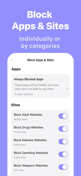 Another benefit to Grace is that it offers enhanced website blocking with built-in filters than automatically block over 50,000 adult, gambling, weapon, alcohol and drug-related websites, and this list is updated regularly. Apple’s own Screen Time tools only focus on blocking adult sites.