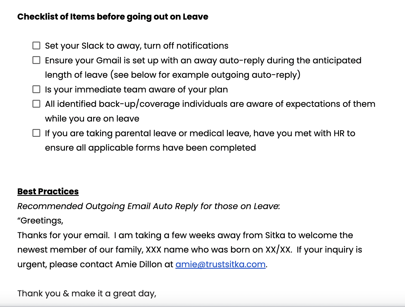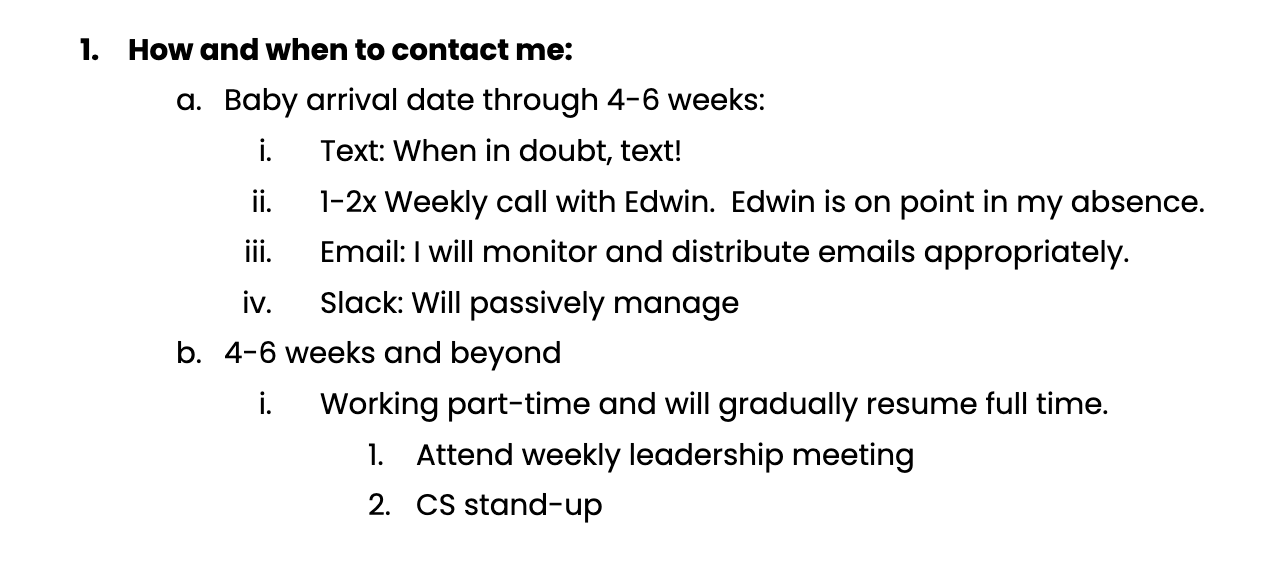 I knew I’d need to go a bit deeper to ensure I was set up for a smooth transition. There’s nothing like having a baby to put pressure on developing a specific timeline for execution and knowledge-sharing across an organization. I co-created a plan that covered how to contact me in the first four-to-six weeks after giving birth, then had a plan for six weeks and beyond.