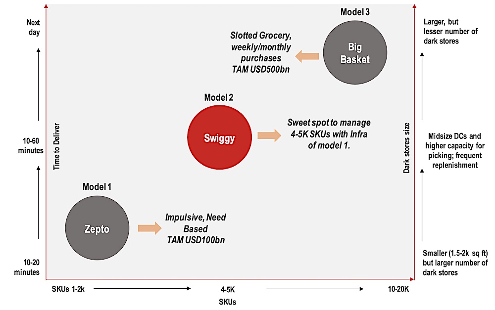 “There are broadly three models of grocery delivery business. On one extreme is quick-commerce (10-15-minute delivery), with highly constrained SKUs (1,000-2,000) and on the other extreme is a full kitchen offering (delivery next day) with 25,000-30,000 SKUs. The former are “instinctive” purchases, while the latter are planned. Theoretically, instinctive purchases are less discount driven and more need driven, while planned are more discount and assortment driven. Somewhere in the middle are 4,000-5,000 SKUs, which cater to both ends with certain benefits and compromises for both instinctive buyers and planned buyers,” they explained.
