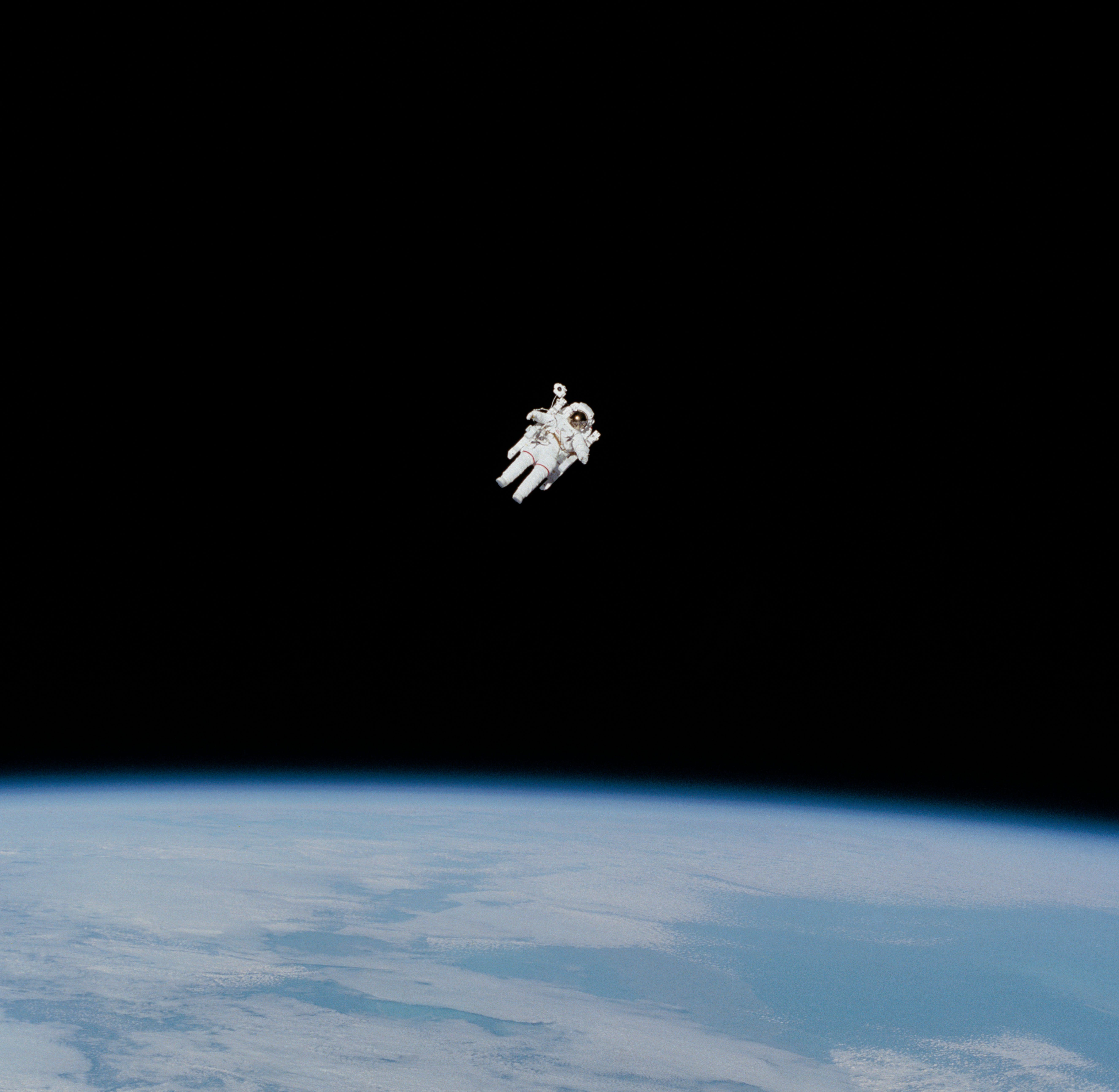 This photo, taken on February 7, 1984, shows astronaut Bruce McCandless II on an untethered space walk. In this photo he’s approaching his maximum distance from the Space Shuttle Challenger. Far out.
