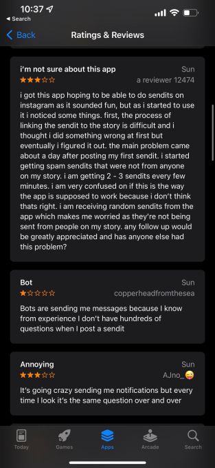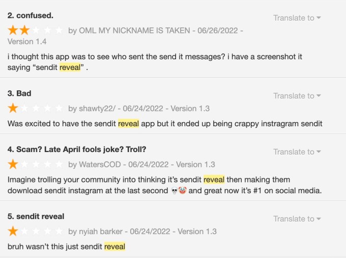 For starters, Sendit for Instagram users have been complaining in reviews the app had originally marketed itself to them as “Sendit Reveal” during the preorder phase. The company, the reviews allege, had promised a new Sendit app that would reveal which friends had sent the anonymous messages. Obviously, this was a big draw for the app’s young users, as everyone wanted to know who had said what.