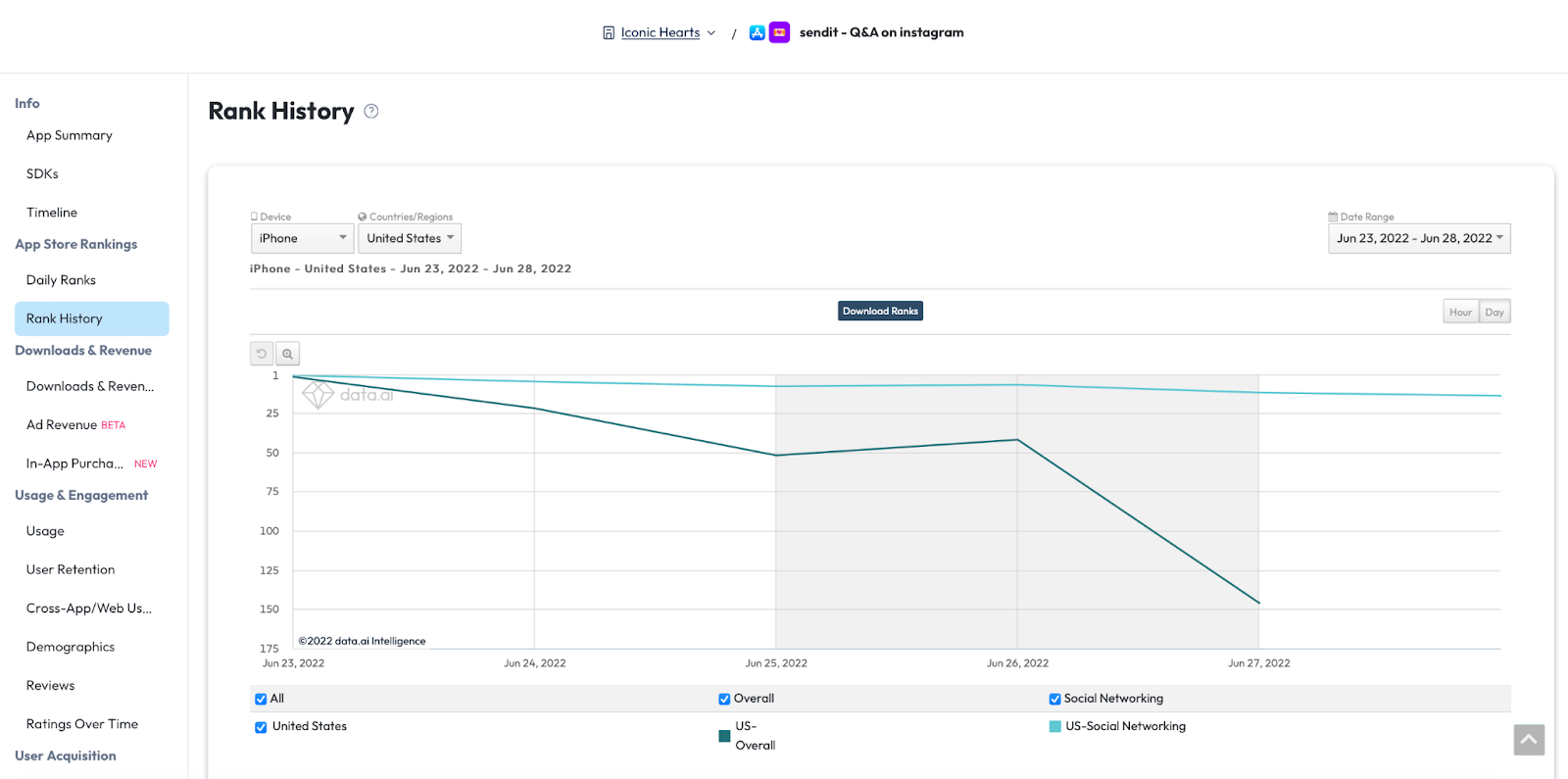 It has since tweaked its name to Sendit – Q&A on Instagram. Data.ai also noted the app shot up to No. 1 at launch within the Social Networking category as well as overall in non-gaming apps in the U.S. App Store from June 23, 2022, through June 28, 2022.