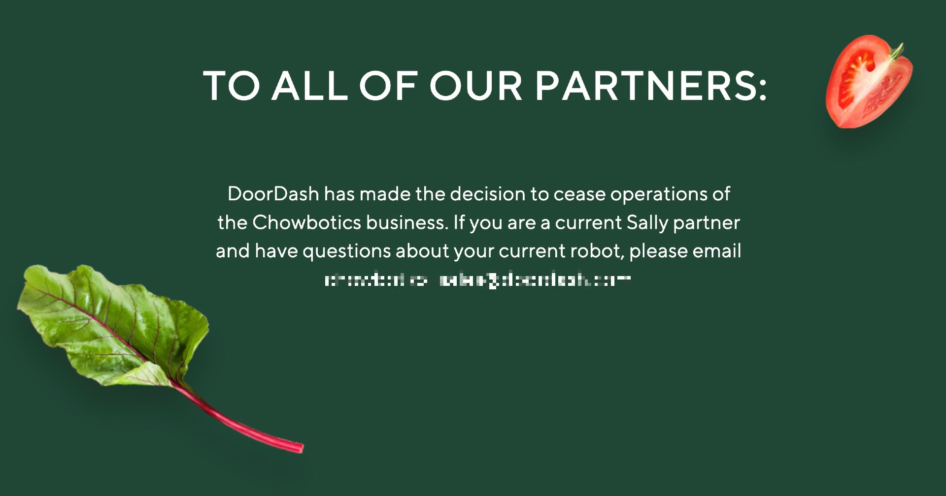We have decided to cease operation of the Chowbotics business, effective August 31st, 2022. At DoorDash, we create an environment to build new products and set high standards to determine when to scale, continue, or cut back investments. We’re always looking for new ways to serve our merchants, exceed consumers’ increasingly higher expectations, and complement our logistics infrastructure.