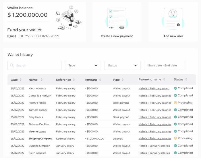 For employers, Kadmos provides a centralized salary payments platform for making and tracking payments, regardless of from where the worker hails.