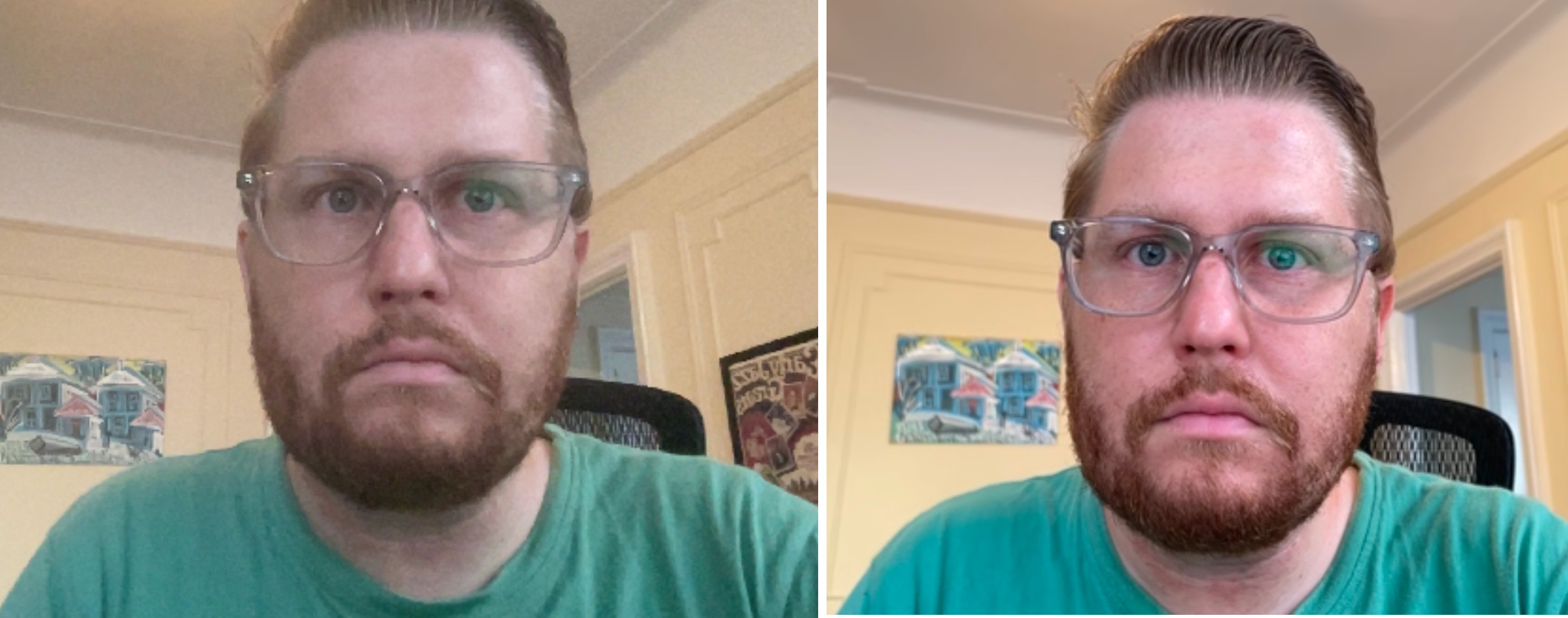 I was honestly a bit surprised by how seamless the two worked together. Once the upgrades are complete, your Mac should automatically detect the connected device and offer it in the drop-down menu of compatible video chat platforms. I tried it out on FaceTime, Zoom and Google Hangouts, and they all were able to use the iPhone. As you can see from below, there’s a marked difference in quality between the 14-inch M1 MacBook’s on-board camera (left) and the rear-facing on the iPhone 12 (right).