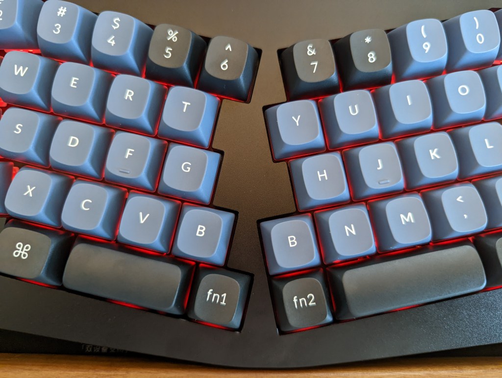 Unless you’re deep into mechanical keyboards, chances are you’ve never heard of an Alice-style board. It’s basically a keyboard that’s split in the middle with both sides slightly angled and curved, with small space bars and B keys on both sides (yes, B keys on both sides.). Otherwise, it’s mostly a standard layout with arrow keys and numbers, but without a numpad or F keys. and while I hesitate to call it “ergonomic,” the angled keys allow for a pretty relaxed wrist position. Unlike “real” split ergonomic keyboards like an ErgoDox EZ or Matias Ergo Pro, all you get is a set angle though and no tenting to raise the middle of the board. In return, though, it’s extremely easy to adjust to an Alice layout and, by extension, the Q8.