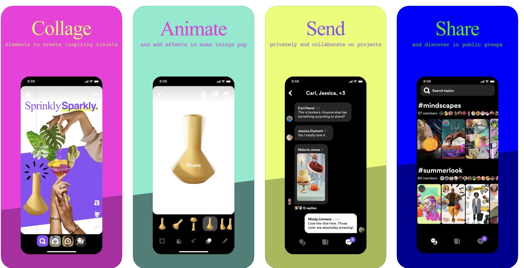 According to Shuffles’ description on the App Store, users can build their own collages using Pinterest’s photo library or snap photos of objects they want to include using the camera. They can also cut out individual objects from within an image using a tap — a feature that recalls iOS 16’s own clever image cutout ability. Images in Shuffles can then be rotated, layered and resized on the screen to create the collage, and animations and effects can optionally be added. The final project can be shared with friends for collaboration or posted to public groups where others can “remix” the original creation in their own way.