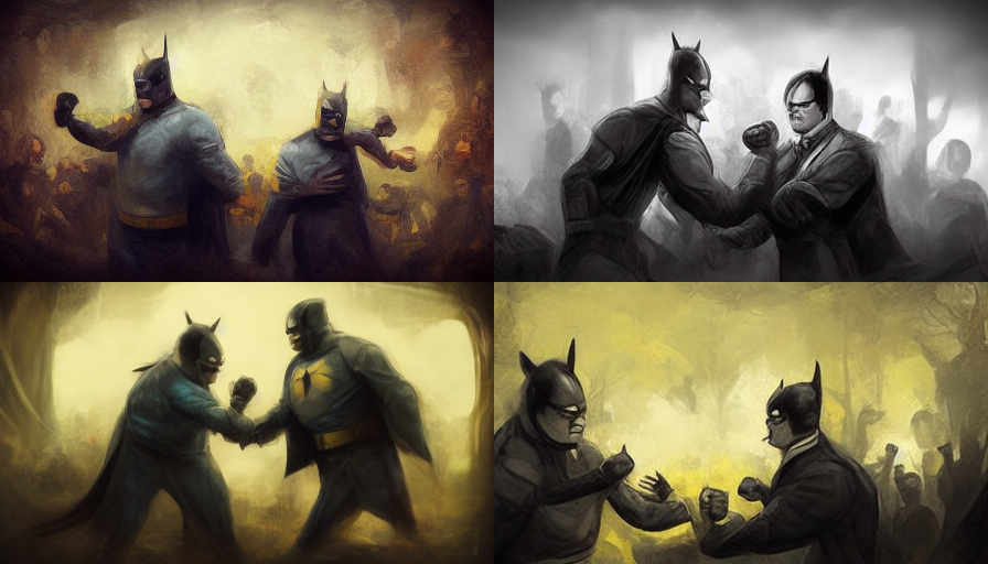 Now, I have a visual mind, but there isn’t an artistic bone in my body. But I don’t need one. I come up with a prompt — for example, Batman and Dwight Schrute are in a fistfight — and the algo spits out four versions of something. From there, I can re-roll (i.e. generate four new images from the same prompt), render out a high-res version of one of the images or iterate based on one of the versions.