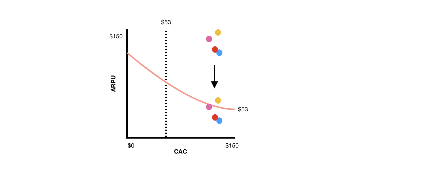 In the chart above, ARPU drops from $137 to $53. More specifically, the colored bubbles represent channels and their CAC/ARPU relationships. Robinhood was acquiring users in the $130 CAC range and expecting ARPU of $137. The shift in these channels depicts how CAC remains constant while ARPU drops.