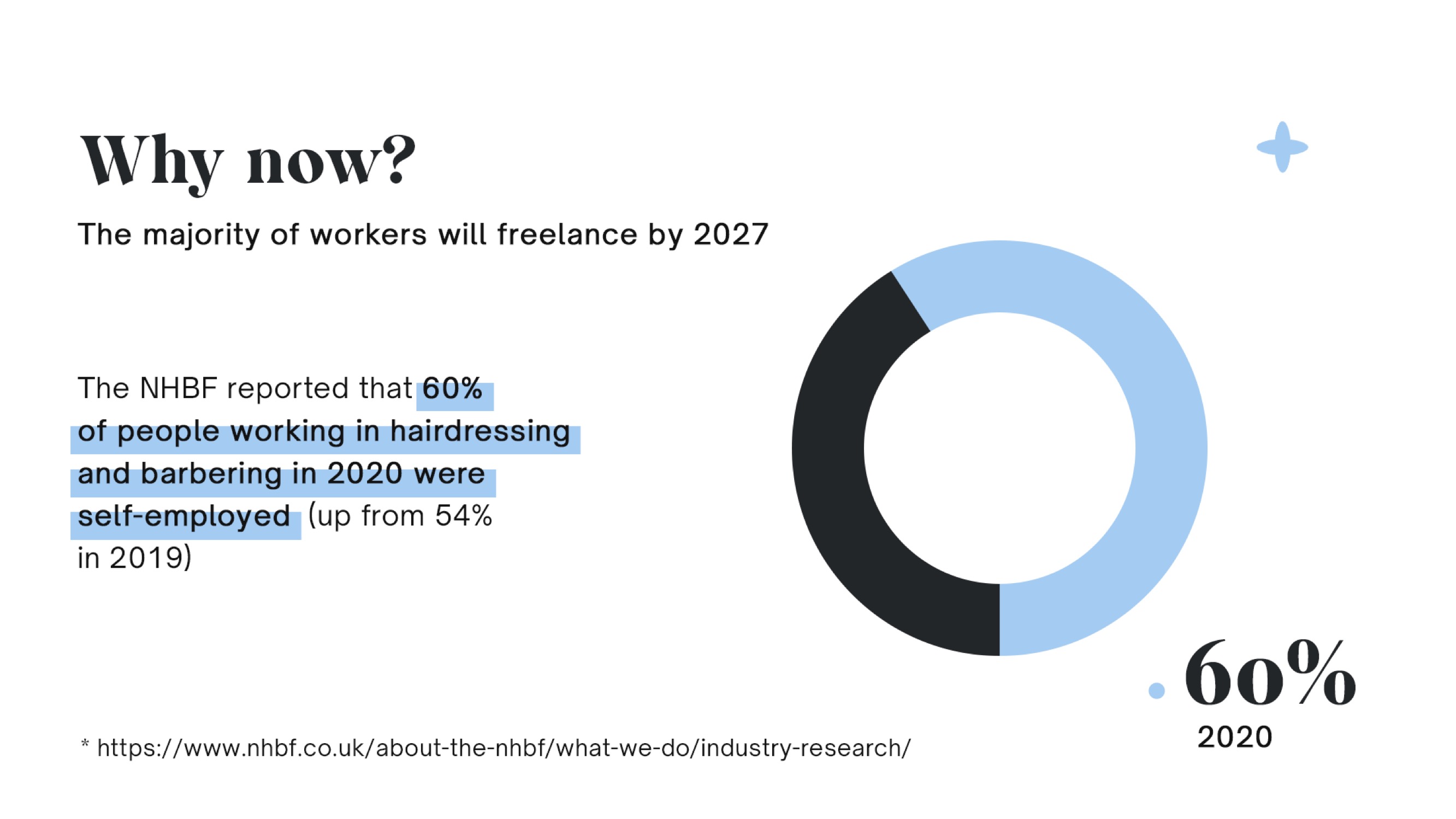 Glambook uses this slide to tell the story of a market in evolution. In 2019, 54% of hairdressing and barbering professionals were self-employed, and by 2020, that had grown to 60%.