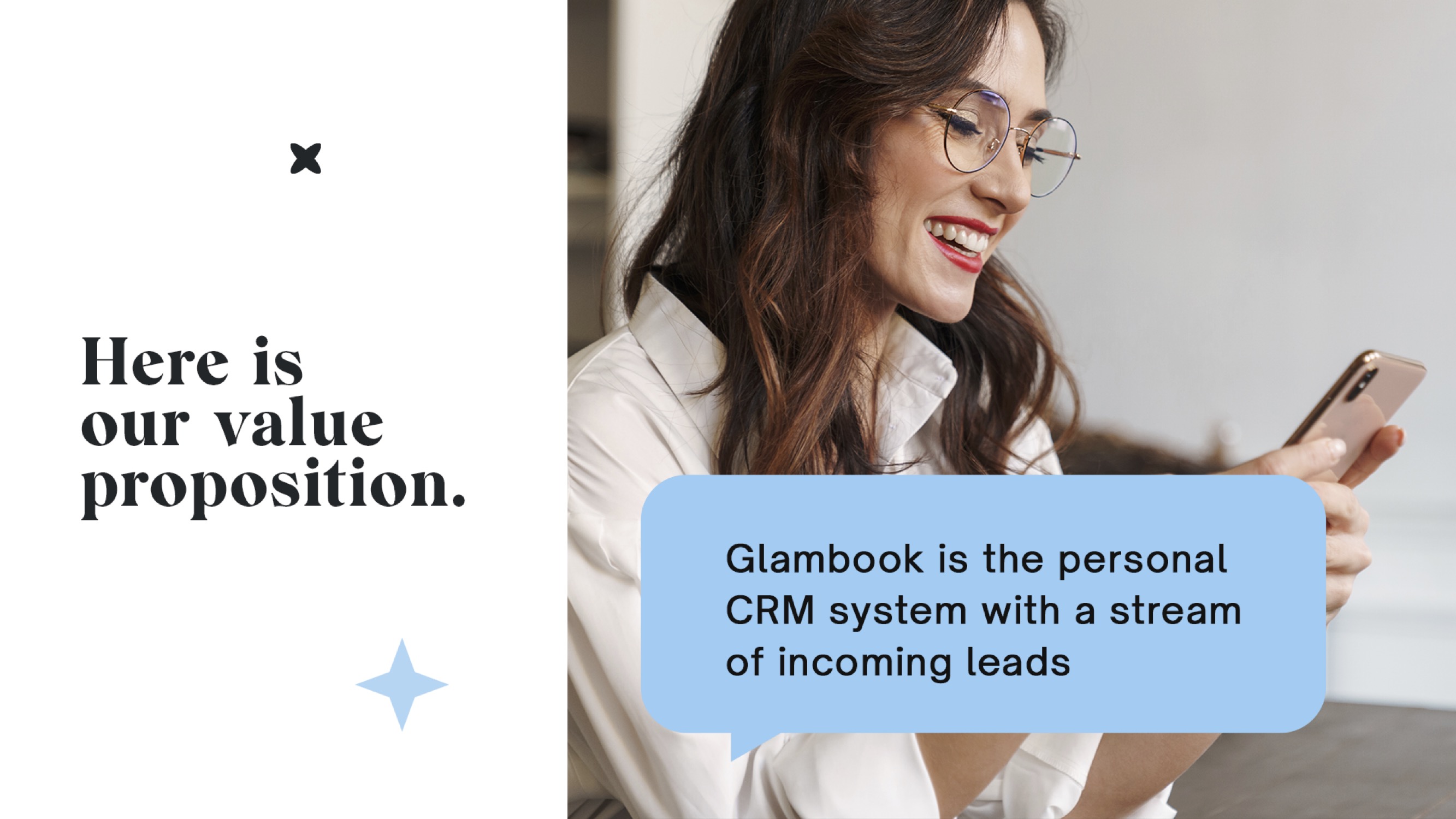 Instead of “a personal CRM system,” would it be possible to put some data behind this? Something like “By using the Glambook CRM, our providers see a 20% increase in customer loyalty, and a 30% increase in per-visit revenue, while reducing no-shows by 33%” would be a lot more powerful and explains not just the what (a CRM) but the why (less wasted time, more revenue, steadier income).