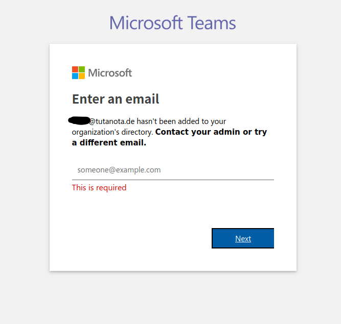 This misclassification means that when a Tutanota email user tries to use this email address to register an account with Teams they get a classic ‘computer says no’ response — with the interface blocking the registration and suggesting the person “contact your admin or try a different email”.