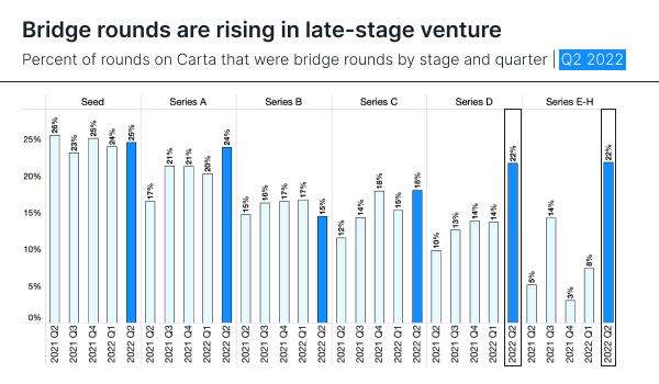 It’s when we get to startups at the Series D and later stage that things get spicy. It appears that the later stage a startup is, the more likely it was in Q2 2022 to raise bridge capital: