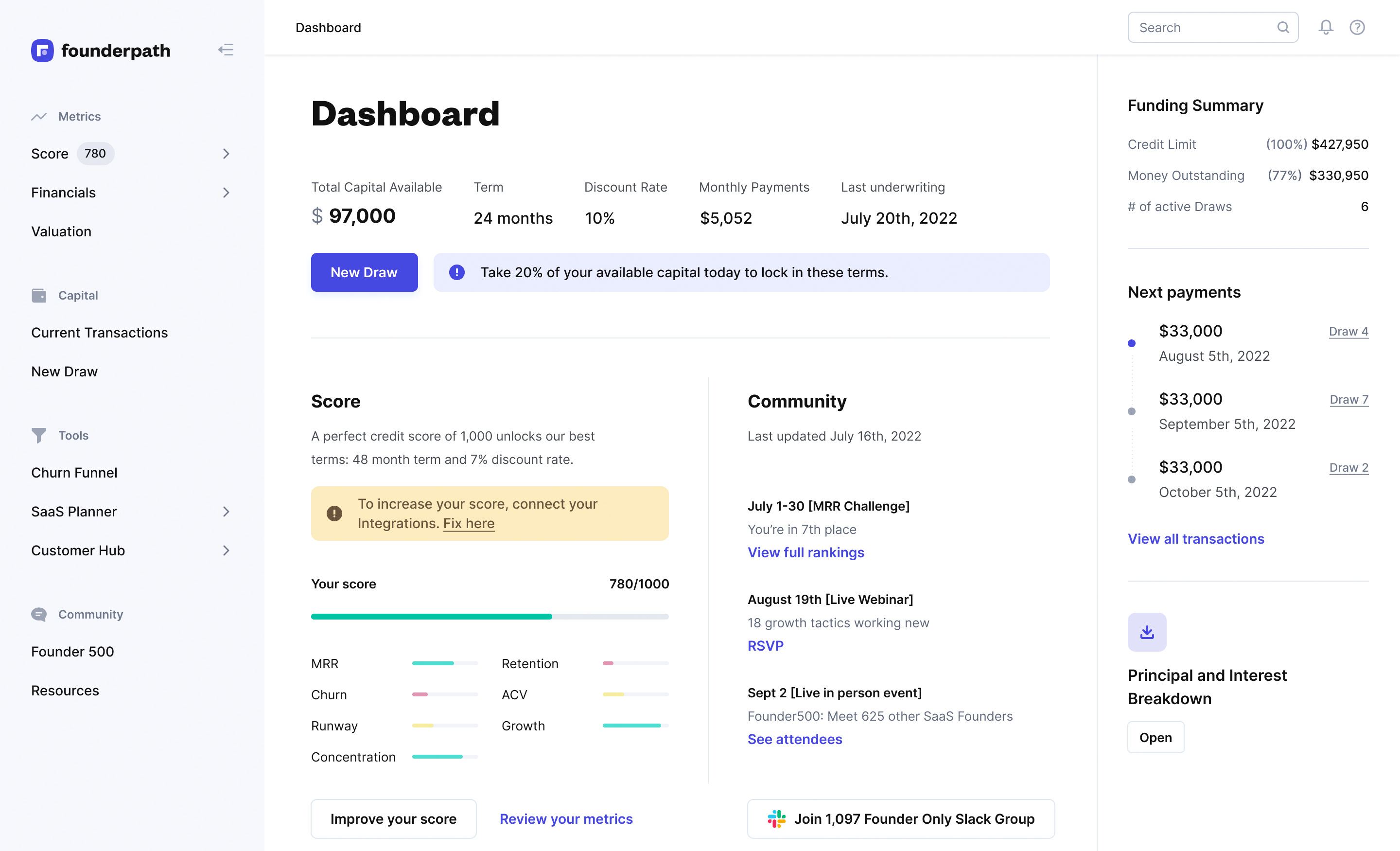Now, Founderpath is not the first (or last) firm that is out to help SaaS companies with non-dilutive financing. It competes directly with Pipe — a marketplace that connects companies with predictable, recurring revenue to investors that was valued at $2 billion last year — and Capchase, which in July of 2021 secured $280 million in new debt and equity funding and has since raised $80 million in equity and secured another $400 million in debt.