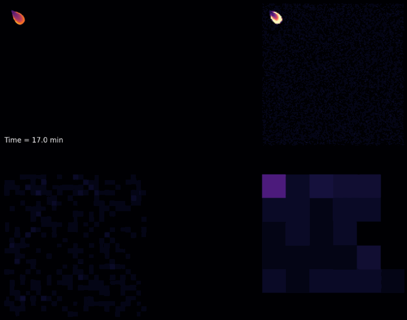 In this case the microwave land monitoring method would be useful for monitoring wildfires — everyone wants to know where they are in real time, but the gear in orbit right now simply can’t provide that information. Muon provided a simulation of how its satellites (top right) would be able to visualize a spreading fire compared with what’s up there (bottom row), which you can see below: