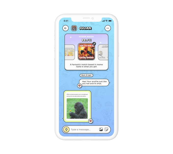 To use the app, a person swipes right to like, left to dislike, and up to love memes from a selection curated via artificial intelligence. Match suggestions will pop on the screen based on meme choices, and the person can select either “Snooze” or “Schmooze.” The algorithm takes into consideration what types of humor both you and the potential match enjoy or reject.