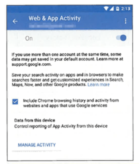 Other versions of the Web & Activity setting which the court found misleading Android users between early 2017 and late 2018 include one which contains a full five possible actions a user could take — a surfeit of choice obviously intended to bamboozle them into leaving the ‘on’ setting as is, since it’s so drastically unclear what anything else available on the screen means.