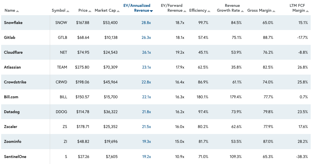 Doubling yearly at scale is impressive and is something that even smaller companies often struggle to do. Public cloud companies generally grow at far slower rates, even if some do post growth numbers around the 100% mark. However, the most valuable public cloud companies — ranked by their present-day revenue multiple — are generally growing slower than the yearly doubling benchmark that the best unicorns are managing today. Therefore, when considering them in the context of their public peers, I tend to slot the best private cloud companies into the upper echelon of the public cloud company valuation matrix — their growth rates simply rank them highly.