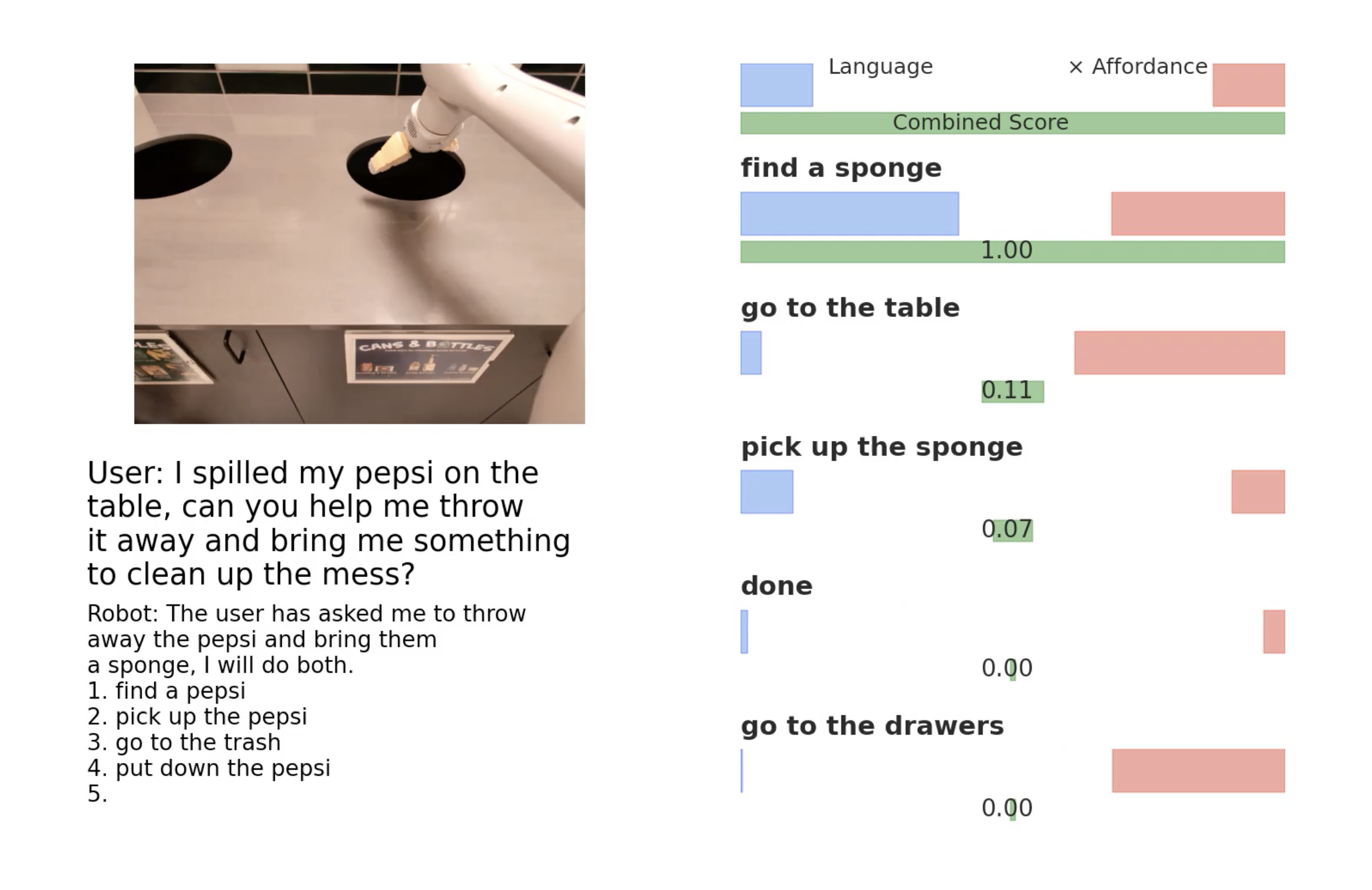 Anyway — I’m poking fun here, but you get the gist; even relatively simple-sounding instructions can, in fact, include a large number of steps, logic and decisions along the way. Do you find the healthiest drink around, or is the goal to get anything that’s healthier than Coca-Cola? Might it make sense to get the drink first, and then mop up the mess, so the human can have their thirst quench while you figure out the rest of the task?