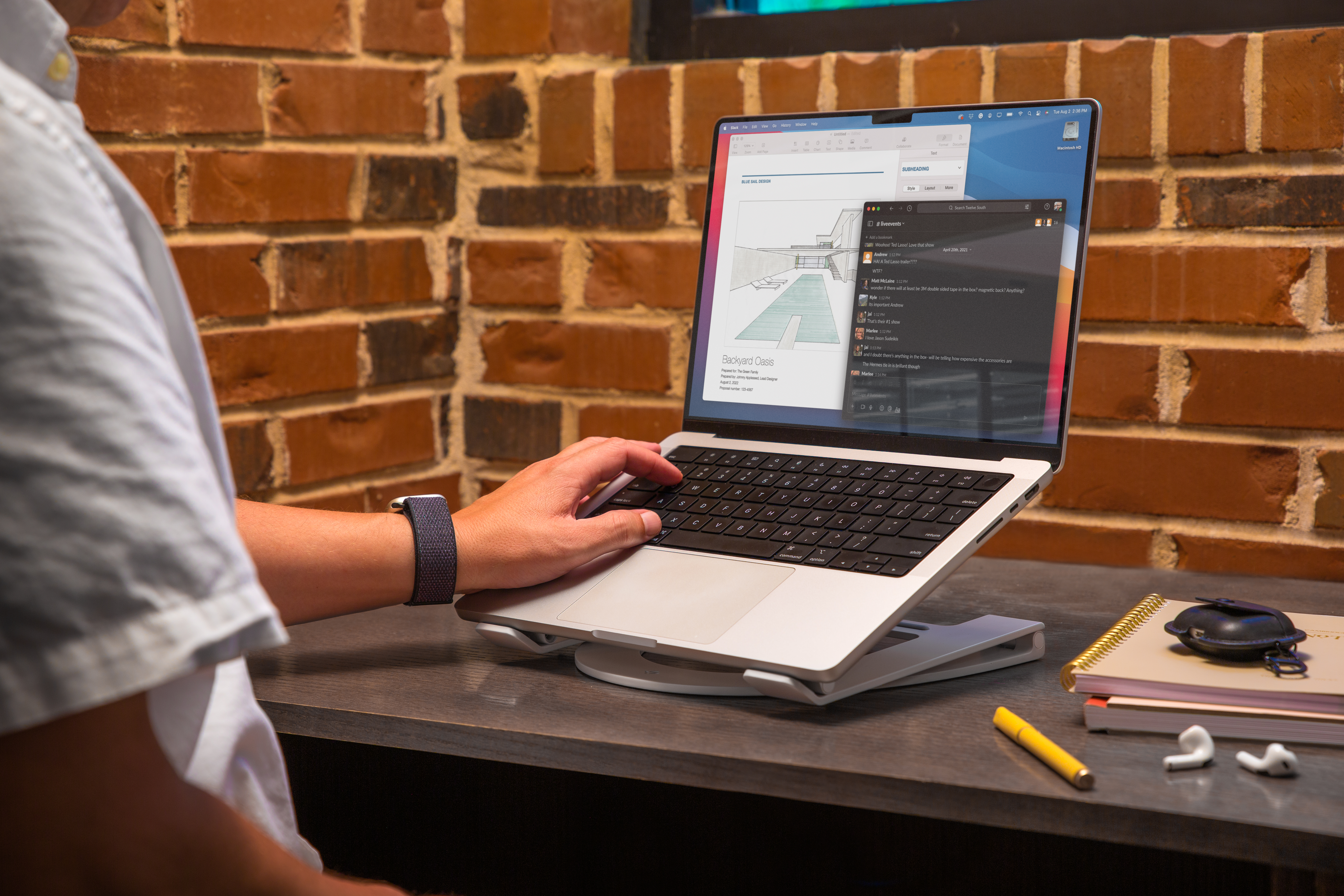 Somewhat ironically, I’ve become a fan of stands after I stopped traveling as a way to use notebooks as a kind of second screen at home. The Curve Flex’s adjustable height makes it possible to position at a similar eye level as your main screen. That, coupled with macOS additions like Stage Manager and Sidecar, offer a more seamless cross-device integration.
