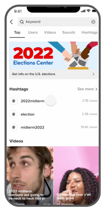 In addition, all videos related to the elections — including those from politicians, candidates, political parties or government accounts — will be labeled with a link that redirects to the in-app election center. TikTok will also host PSAs on election-related hashtags like #midterms and #elections2022.
