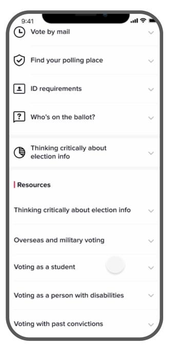 The new feature will allow users to access state-by-state election information, including details on how to register to vote, how to vote by mail, how to find your polling place and more, provided by TikTok partner NASS (the National Association of Secretaries of State). TikTok also newly partnered with Ballotpedia to allow users to see who’s on their ballot, and is working with various voting assistance programs — including the Center for Democracy in Deaf America (for deaf voters), the Federal Voting Assistance Program (overseas voting), the Campus Vote Project (students) and Restore Your Vote (people with past convictions) — to provide content for specific groups. The AP will continue to provide the latest election results in the Elections Center.