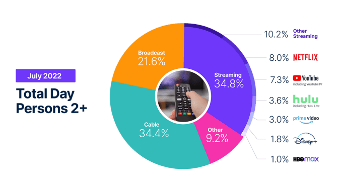 Streaming viewership reached new highs last month, exceeding cable usage for the first time, according to Nielsen. The measurement firm today released its total TV and streaming report for July, stating that streaming represented a 34.8% share of total TV viewing in the U.S. — an increase of 22.6% compared to July 2021. Cable consumption was a little behind at 34.4%, an 8.9% drop from the year prior and a 2% decline compared to June.