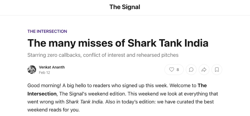 Signal says it is aiming to serve savvy audiences in India and beyond. It has amassed more than 38,000 subscribers, a base that includes several unicorn founders, lawmakers and policy executives. Its newsletter goes out at 8 AM and asks just five to seven minutes of readers’ time, said Narayanan.