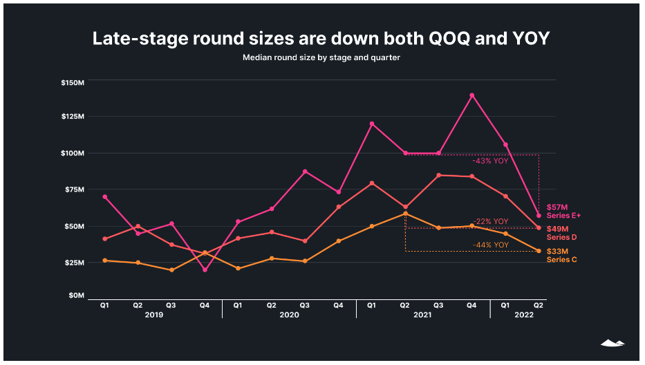 Parsing a chart shared by the company’s analysis team, the median Q2 2022 Series E is now smaller than median Series D rounds back in 2021, while Series D rounds are now smaller than peak 2021-era Series C rounds, measured in median terms.