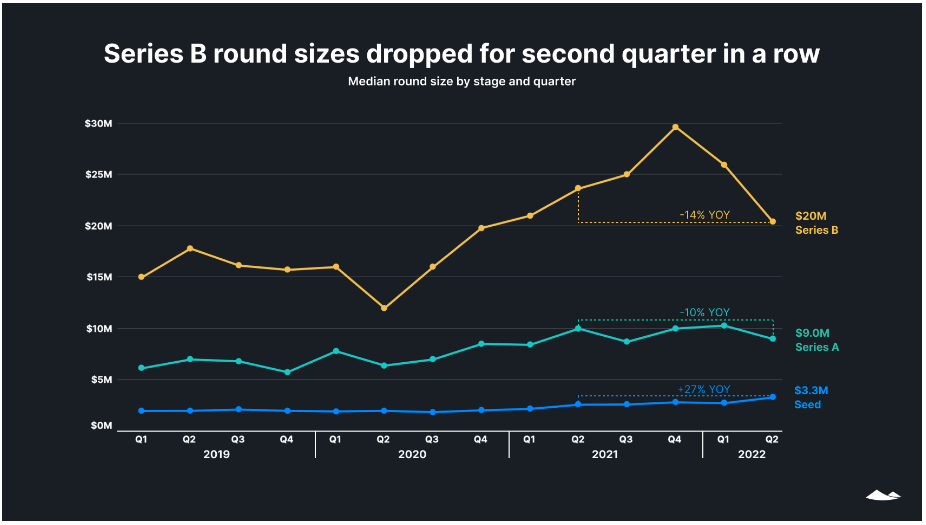 Seed is misbehaving when contrasted with what we’re seeing in other startup stages, at least from a median-round size perspective. As Carta notes in the digest of its Q2 2022 data, “the median seed valuation reached $3.3M — up 20% [compared to the sequentially preceding quarter] and 27% [from the year-ago data point].”