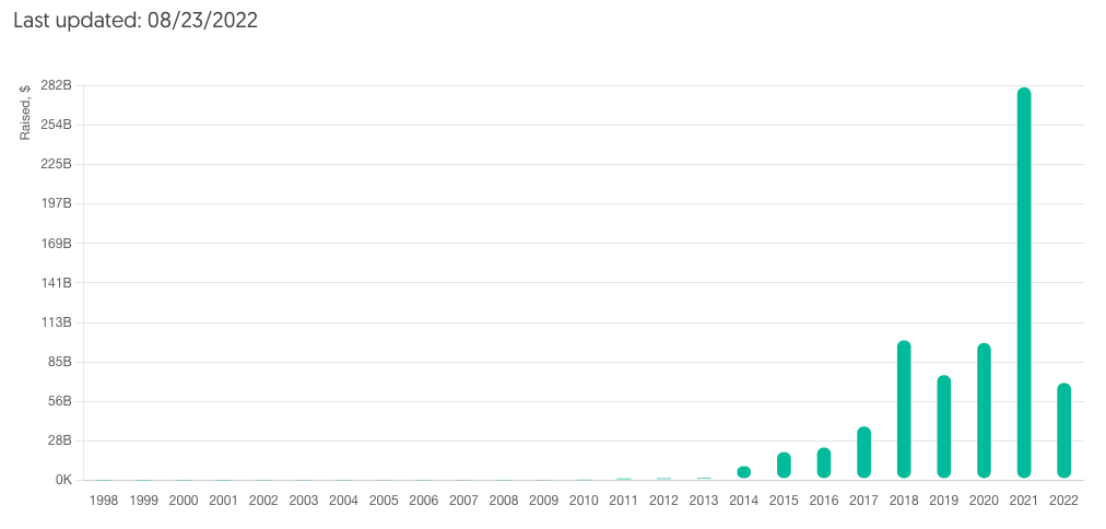 Thanks to that bounce, 2021 nearly tripled the respective $101 billion and $99 billion that unicorns raised in 2018 and 2020 with a staggering $282 billion haul. That’s a figure that I doubt we’ll see beaten in some time. (Inflation isn’t that hot!)