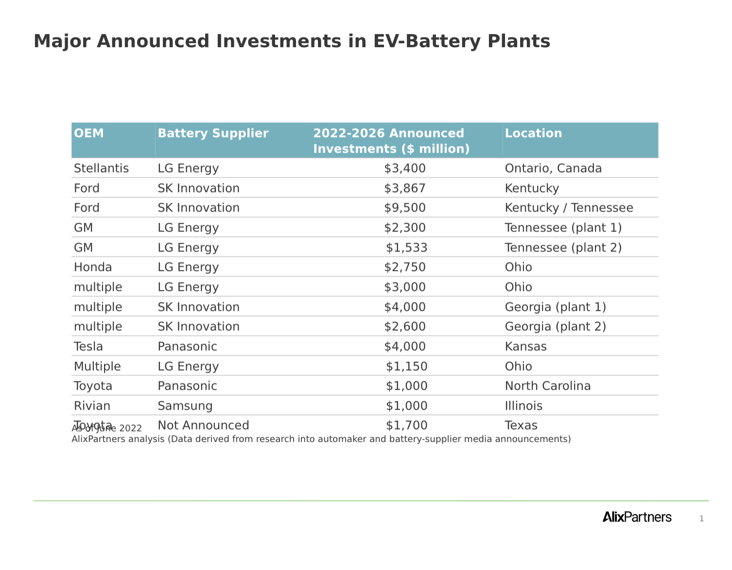 Automotive manufacturers and suppliers have announced more than $38 billion in investment through 2026 to boost battery production in the U.S., according to AlixPartners.