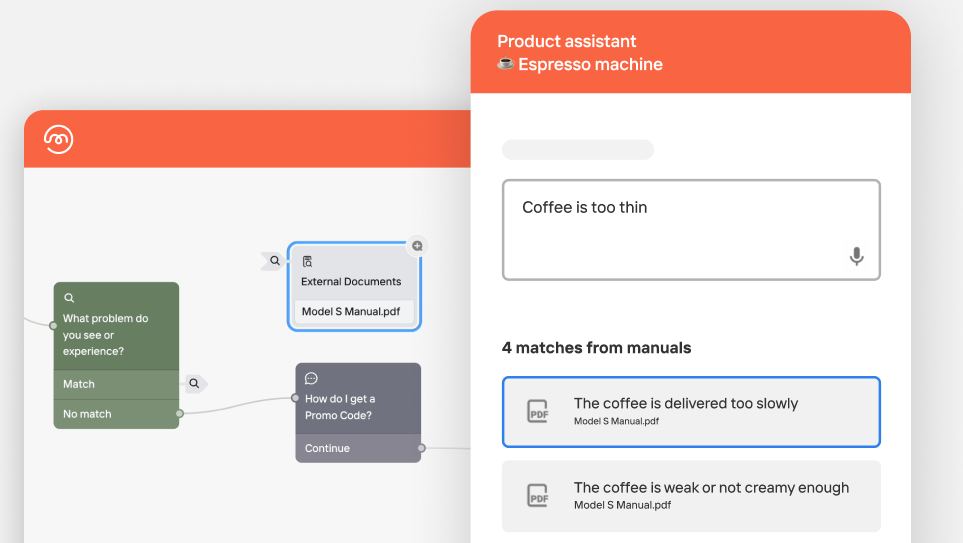 This essentially means that Mavenoid takes care of all the content-scraping (documentation, manuals, FAQs, etc.), and optimizes the knowledge base structure specifically for automated hardware support. This is designed for more complex questions that traditional bot-builders would likely struggle with, and follows a non-linear model that considers the specificities of the problem while using natural language understanding (NLU) to identify the real intent behind a user’s support request.