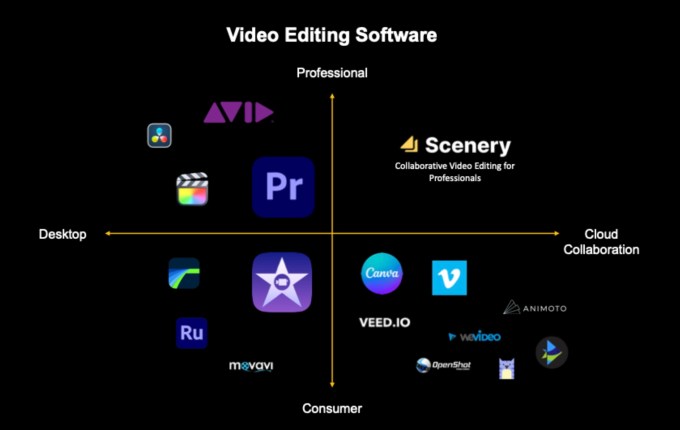 - Competitive landscape. This is NOT a feature comparison but rather a market mapping to educate them on the players. Many use a 2×2 map to show who is in the market based on two attributes where your company sits alone in the top-right quadrant. This may feel counterintuitive, but you want big, important players on this map as you want your prize to be worth winning. Example from Scenery: