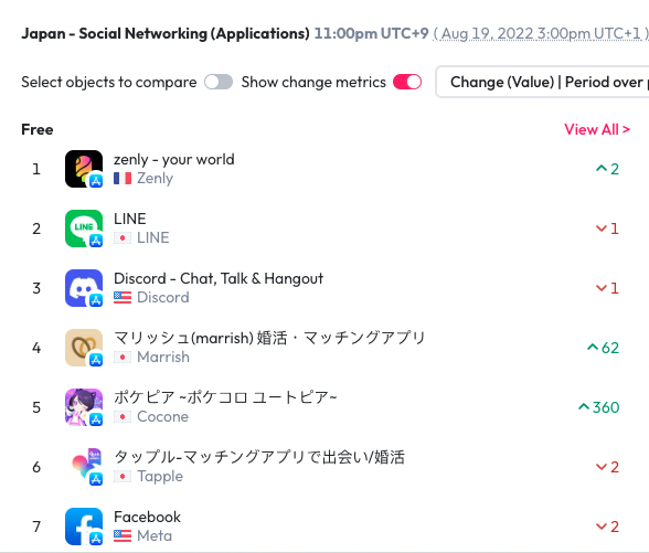 While Data.ai’s numbers also show that Zenly is regularly among the top 20 downloaded social apps globally, digging deeper into market-specific metrics reveals that it often out performs every single other social app. In Japan, for example, Zenly is typically in the top five or 10 apps, but it often rises to pole position ahead of Facebook, WhatsApp, Discord and home-grown market leader Line, as this iOS chart from August 19 shows.