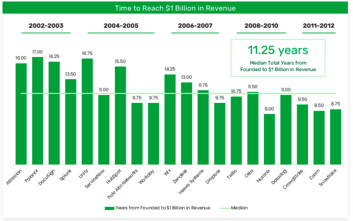 What we can see here is an acceleration in the rate (measured in time) at which startups go from birth to $1 billion in revenue, measured on a median basis. It has fallen from the high teens to the high single digits, counting in years. This is a large part of why startups are worth more today — they grow faster, which means that they have more value.