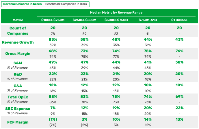 Given that we are discussing companies that reach $1 billion in revenue (the dataset includes 20 such companies, contrasted with a far greater number of private-market companies in revenue buckets from $100 million to $1 billion), and not some net income result, we’re more discussing growth than profitability. As such, the metrics that we care about are often more tuned to top-line expansion than net margins.
