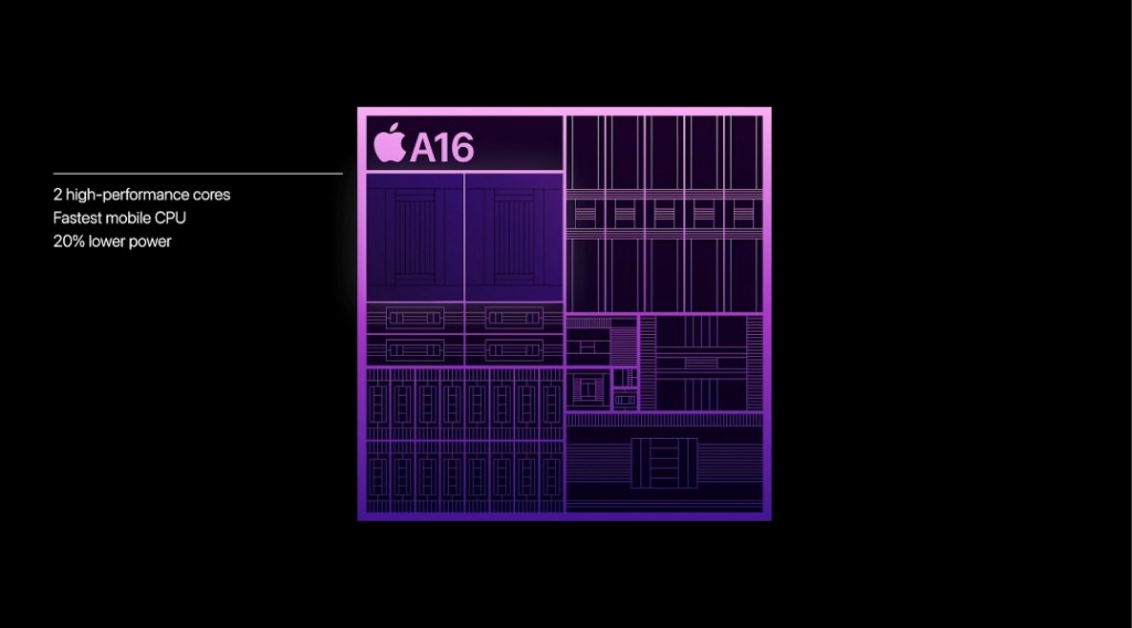 Apple says that the A16 Bionic has a multicore processor with two high-performance cores and four efficiency cores, a five-core GPU and a 16-core neural engine for performing up to 17 trillion operations per second. The company further claims the high-performance cores use 20% less power compared to the A15 Bionic’s performance cores, while the efficiency cores use a third of the power of unnamed competitor chips.