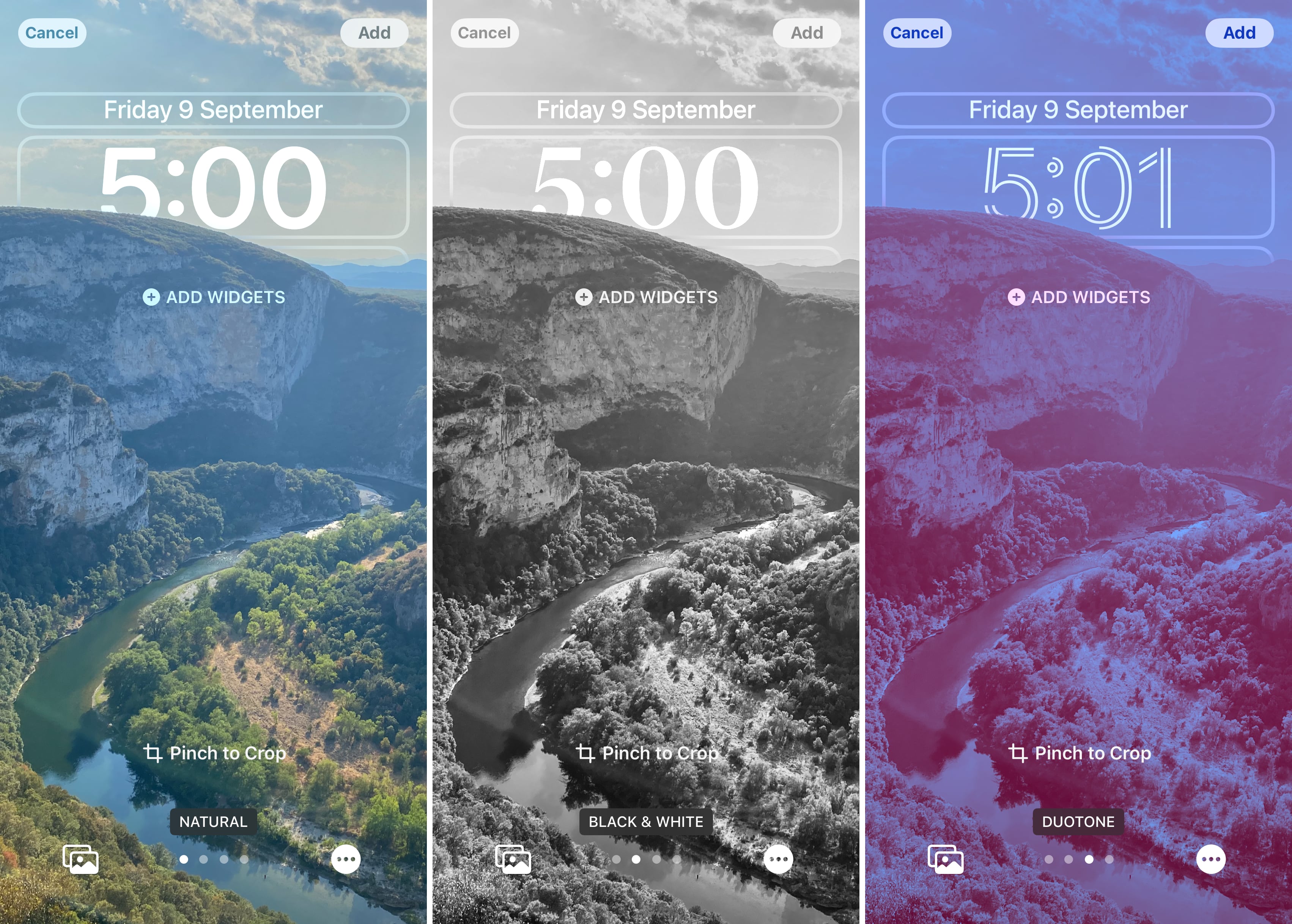 Apple lets you apply an effect on the photo by swiping left and right. By default, you get an unedited version of the photo (“natural”), but you can put an emphasis on the subject in the foreground with the “studio,” “black & white” or “color backdrop” effects. If you’re more into minimalistic wallpapers, you can apply a “duotone” or “color wash” effect to turn a photo into a monochrome wallpaper.