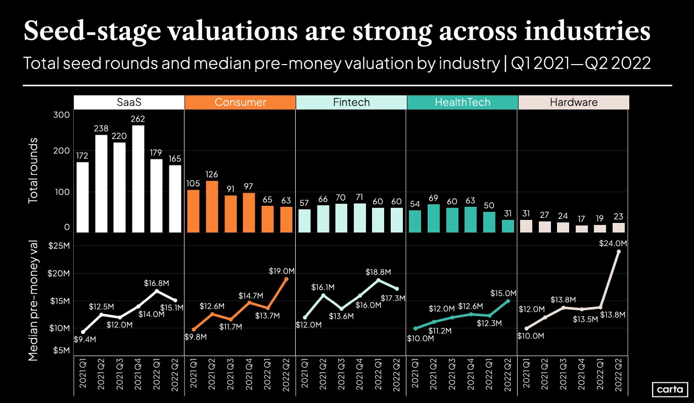 Data from Carta indicates that through the second quarter of 2022, seed valuations in consumer, health tech and hardware startups actually ticked higher. At the same time, valuations for software (SaaS) and fintech companies fell, but not as much as we might have anticipated.