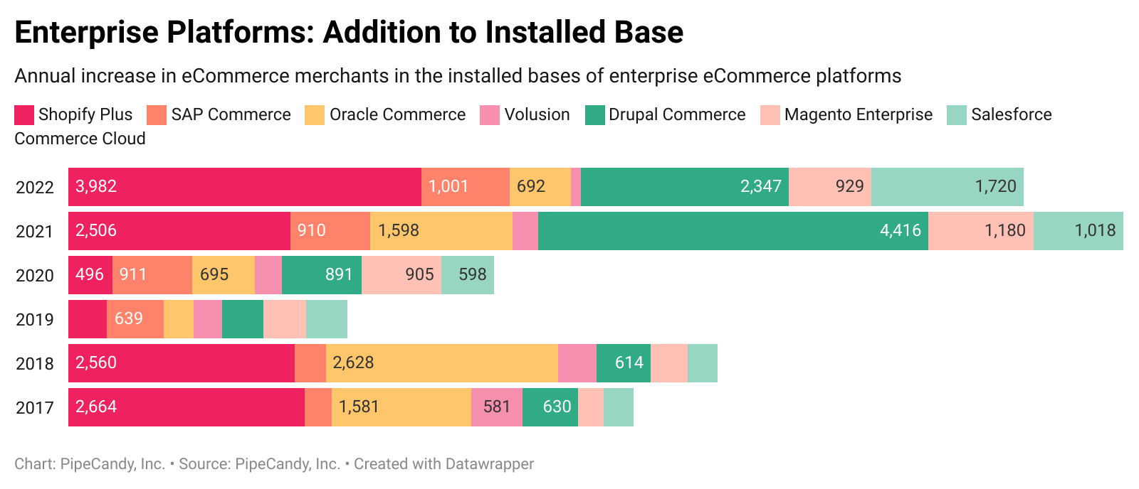 The top enterprise e-commerce platforms have added more than 10,000 merchants. That’s immense, especially as the year is still far from over, and these platforms already have just 1,000 merchants shy of last year. This year promises to be the year of net-new additions for enterprise e-commerce platforms.