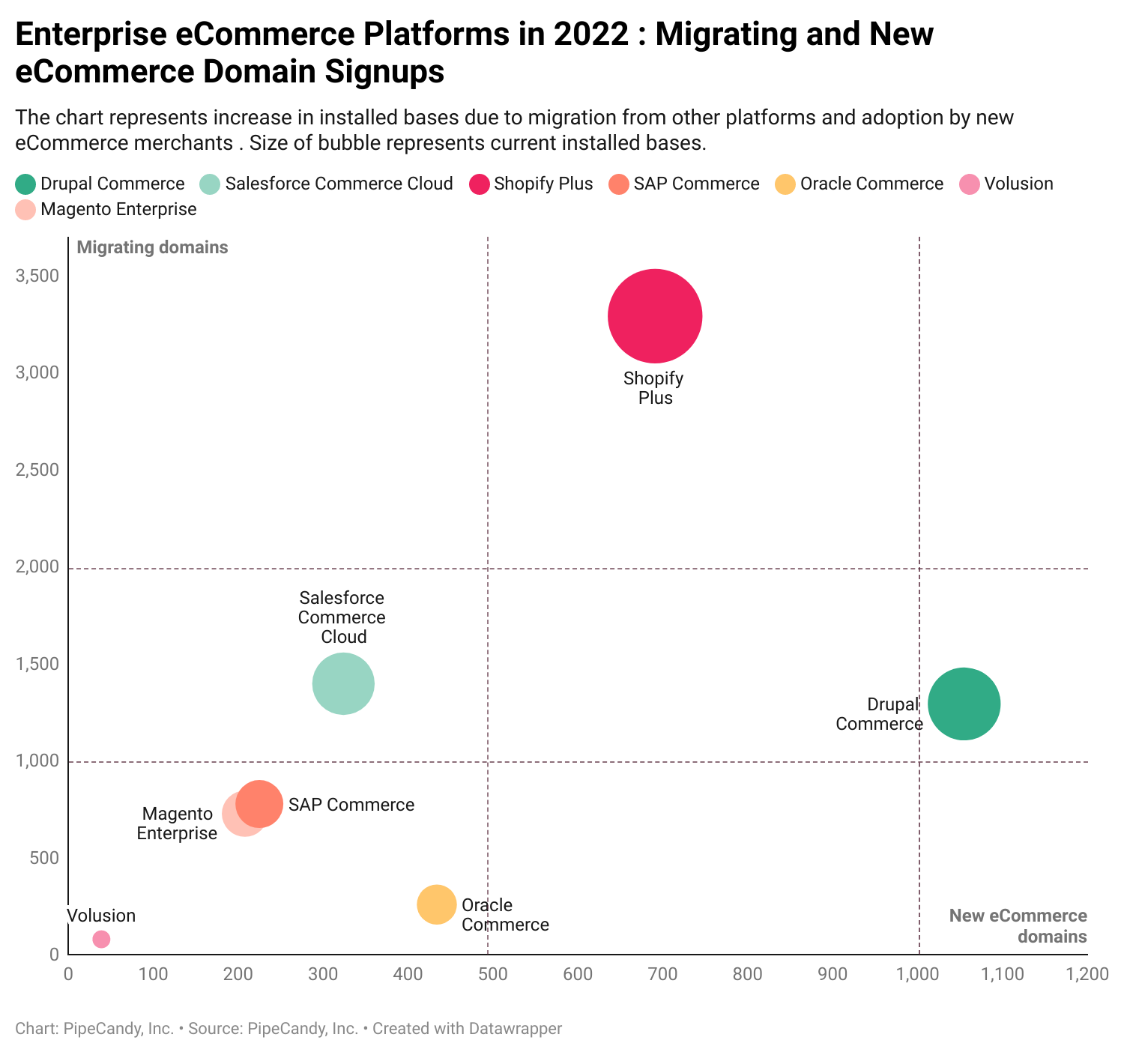 Shopify Plus demonstrated its strength by being the leading platform both in terms of adoption by new e-commerce websites as well as migrations. Yet, Shopify is hardly enterprise-grade and is not seen as the platform to compete against. It’s not what SAP is to ERP or Salesforce is to CRM.