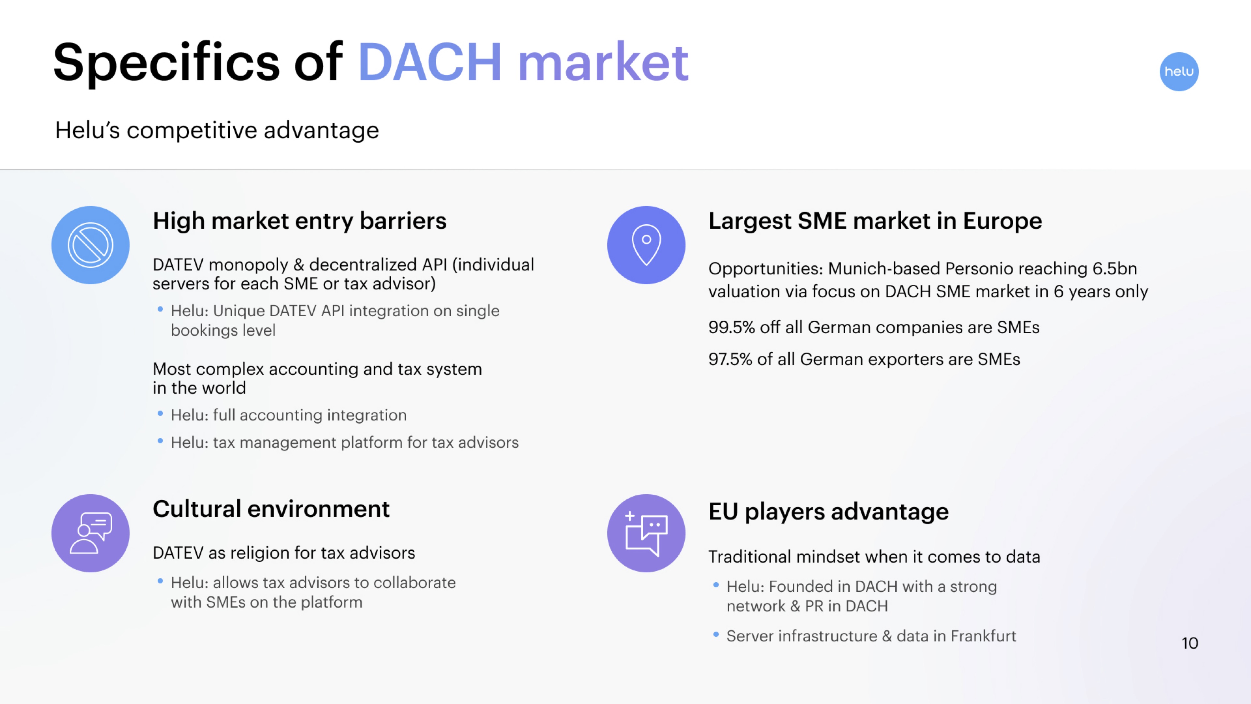With an additional twist: The German Mittelstand is a powerful force to be reckoned with. These are thousands of small but efficiently run businesses that are hard to imagine in any other country; in the U.S., small companies tend to get rolled into bigger ones. As the company points out, 99.5% of all companies and 97.5% of all exporters fall into the SME category. That’s a landscape most international SaaS businesses don’t really know what to do with; local and cultural knowledge and building tools that work very well for this specific subset of companies mean that Helu could end up with a formidable moat. The company doesn’t come straight out and say that this is a “winner take all” market, but I think that’s what they are getting at.