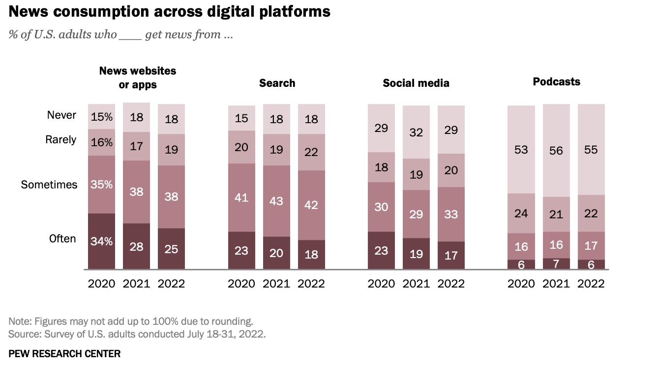 Updated, 9/23/22 to add when the usage described was “often” for getting news via web, social and through digital devices, for further clarity as it relates to Pew’s questions about regular usage.